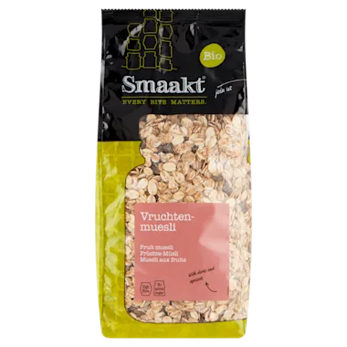 Ingrediënten: Graanvlokken* 76% (HAVER*, GERST*, ROGGE*, TARWE*), gedroogde vruchten* (rozijnen* 7% [rozijnen*, zonnebloemolie*], abrikozenstukjes* 5% [abrikozen*, rijstebloem*], dadelstukjes* 5% [dadels*, rijstebloem*], krenten* 4% [krenten*, zonnebloemolie*]), zonnebloempitten*, kasha* (geroosterde boekweit*), *=biologisch