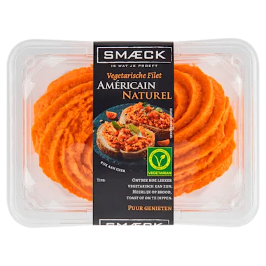 Crème Américain Naturel is een spread op basis van Valess. Het heeft de frisse smaak en bite zoals je van een filet Américain gewend bent maar is gemaakt van melkvezels.
