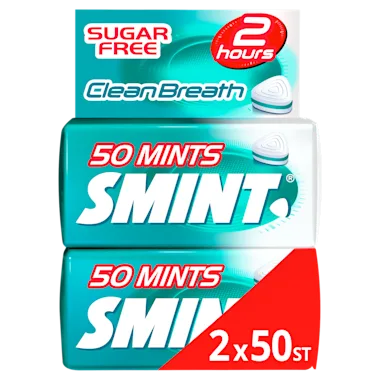 Extra zekerheid over een frisse adem? Dan hebben we voor jou Smint 2h(ours) Clean Breath Intense Mint voor 2 uur schone adem! Een intens verfrissend en suikervrij mintje in 2 blikjes van 50 stuks.