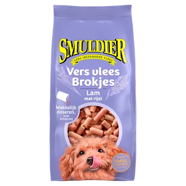 De lekkerste brokkenmaaltijd?! Smuldier Vers Vlees Brokjes combineert de smaak en kwaliteit van Smuldier met het gemak van brokjes. Gemaakt van vers vlees (meer dan 80%), eenvoudig te portioneren en snel ontdooid! Als complete hondenvoeding zeer geschikt om (een deel van ) de brokkenmaaltijd te vervangen, voor 100% smulgarantie.