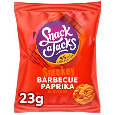 Snack a Jacks® Barbecue Paprika smaak zijn een luchtige rijst- en maissnack in handige portieverpakking.