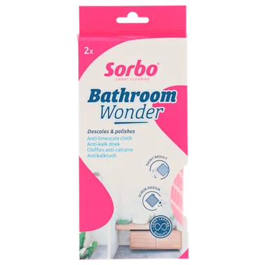 De Sorbo Bathroom Wonder is een effectieve poetsdoek tegen kalk en zeepresten. De doek heeft een scrub- en een poetszijde, die allebei geen krassen achterlaten op het sanitair.