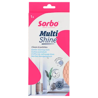 Voor een glanzend en streeploos schoon resultaat op vele oppervlakken gebruik je de zachte Sorbo Multi Shine. De doek is perfect voor kwetsbare oppervlakken zoals sanitair, glas of in de keuken. Of gebruik de doek als finishing touch na de schoonmaakklus, voor een stralend resultaat!