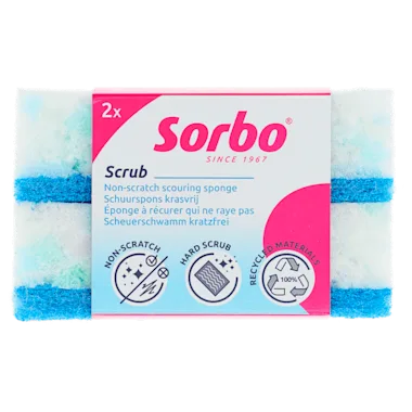 De Sorbo Schuurspons recycled krasvrij is een viscose spons met een zacht, krasvrij schuuroppervlak. De spons is gemaakt van gerecycled PU schuim en gerecyclede PET flessen.