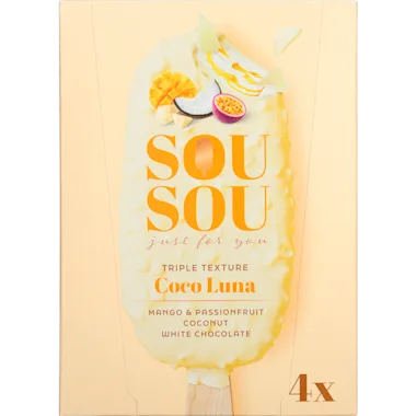 59% wit chocolade-ijs met kokossmaak met 9% mango-passievruchtensaus omhuld met 31% witte chocolade en 1% kokosmakronen