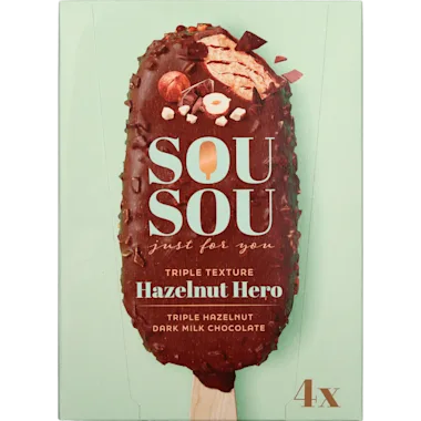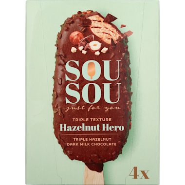58% hazelnootijs met 6% hazelnootsaus omhuld met 31% donkere melkchocolade en 5% hazelnootstukjes
