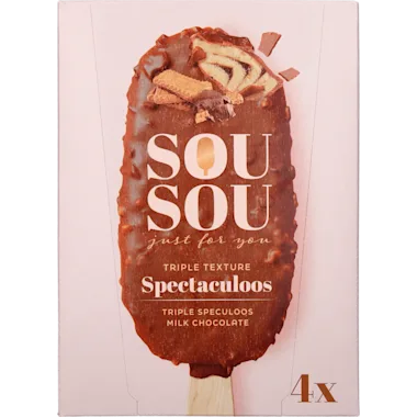 60% speculoosijs met 6% speculoosssaus omhuld met 31% melkchocolade en 3% speculoosstukjes