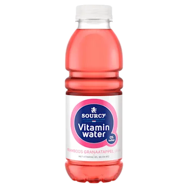 Koolzuurvrije drank op basis van bronwater met de smaak van framboos en granaatappel, met toegevoegde vitamine B5, B6 en B12, thee-extract, met zoetstoffen.