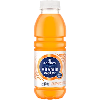 Koolzuurvrije drank op basis van bronwater met de smaak van mango en guave, met toegevoegde vitamine C, B5, B6, B8 en B12, met zoetstoffen.