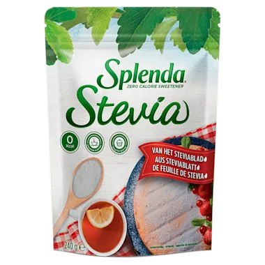 True Taste. Kristal zoetstof uit het Steviablad. in drinks. baking, sprinkling. 0 calories* (per theelepel 5g). Geen bittere nasmaak. Splenda Stevia krijgt zijn unieke zoetheid, zonder bittere nasmaak, van het heerlijke Reb D extract uit Steviablad. 1 theelepel suiker (5 g) is 1 theelepel Splenda Stevia (5 g).
