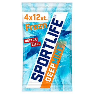 Sportlife Frozn Deepmint, een suikervrije kauwgom met een extreem frisse pepermunt smaak. De speciale blauwe coating zorgt voor een explosie van frisheid. Nu met een extra laagje voor een betere bite.