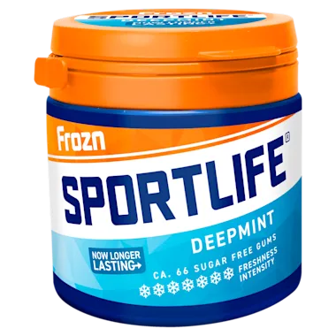 Sportlife Frozn Deepmint, een suikervrije kauwgom met een extreem frisse smaak. Dankzij het verbeterde recept blijft de kauwgom nóg langer fris! Verpakt in een plant-based pot met 66 gums, handig voor in de auto of op je bureau.