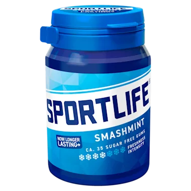 Sportlife Smashmint, een suikervrije kauwgom met een heerlijke frisse smaak. Dankzij het verbeterde recept blijft de kauwgom nóg langer fris! Verpakt in een plant-based pot met 35 gums, handig voor thuis of onderweg.
