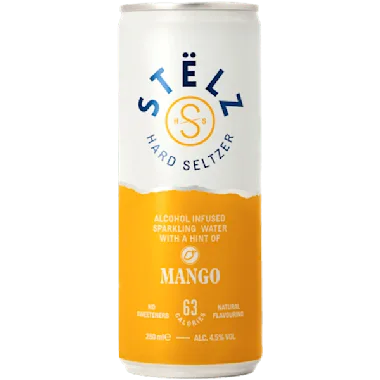 STËLZ Hard Seltzer Mango bestaat uit bruiswater, een vleugje mango en 4,5% alcohol. Geen suiker, geen koolhydraten, geen gluten.