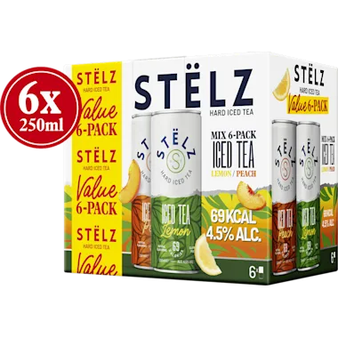Het beste van STËLZ in een Value 6-pack. Probeer ze allebei! STËLZ Hard Iced Tea bevat de smaak van thee-extracten met een vleugje fruit en 4,5% alcohol. Zonder prik. Smaken: citroen en perzik