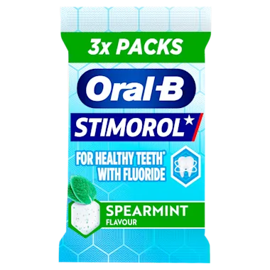 Stimorol Oral-B Spearmint is een suikervrije kauwgom met fluor. De tandkundige expertise van Oral-B en de frisheid van Stimorol komen samen in deze unieke kauwgom.