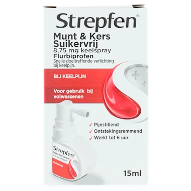 Ingrediënten: Elke dosis (3 verstuivingen) bevat 8,75 mg flurbiprofen, Hulpstoffen: betadex, dinatriumfosfaatdodecahydraat, citroenzuurmonohydraat, methylparahydroxybenzoaat (E218) en propylparahydroxybenzoaat (E216), natriumhydroxide, muntsmaakstof, kersensmaakstof, N,2,3-trimethyl-2-isopropylbutanamide, natriumsaccharine, hydroxypropylbetadex en gezuiverd water., 15 ml (ongeveer 83 verstuivingen).