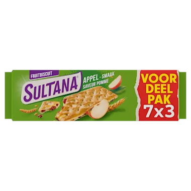 Sultana Appel is een lekker en verantwoord tussendoortje waardoor je weer fruitig verder kunt! Deze fruitbiscuit is zoet van smaak door de fruitvulling van appel en gedroogde druiven.