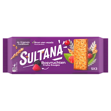 Ingrediënten: TARWEbloem, gedroogde druiven 27,0% (rozijnen en krenten in wisselende verhoudingen), suiker, plantaardige olie (zonnebloem), vulstof (maltitolstroop), maltodextrine, bevochtigingsmiddel (glycerol), HAVERvezels 1,3%, bosvruchtenpuree 1,2% (braam, framboos, rode bes, aardbei), LACTOSE en MELKeiwitten, rijstebloem, TARWEzemelen, rijsmiddelen (natriumcarbonaten, difosfaten, ammoniumcarbonaten), glucosestroop, natuurlijke aroma's, zout, magere MELKpoeder, geleermiddel (pectinen), zuurteregelaars (natriumcitraten, citroenzuur), stabilisator (calciumlactaat)