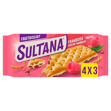 Sultana Framboos is een lekker en verantwoord tussendoortje waardoor je weer fruitig verder kunt! Deze fruitbiscuit is zoet van smaak door de fruitvulling van framboos en gedroogde druiven.