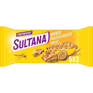 Sultana Mango Passievrucht is een lekker en verantwoord tussendoortje waardoor je weer fruitig verder kunt! Deze fruitbiscuit is zoet van smaak door de fruitvulling van mango, passievrucht en gedroogde druiven. Handig per 3 stuks verpakt.
