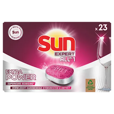 Sun Expert All-in 1 Extra Power vaatwastabletten bevatten de beste formule van Sun, voor zichtbaar superieure reiniging van de vaat. De All-in 1 vaatwastabletten bieden uitstekende vlekverwijdering en verwijderen zelfs de meest hardnekkige etensresten. Ze bevatten actieve ontvetters, waardoor de vaat wordt ontvet en hebben bovendien een heerlijk frisse geur. Sun Expert All-in 1 Extra Power vaatwastabletten reinigen niet alleen de vaat, maar zorgen ook voor de machine; ze voorkomen kalkaanslag in de vaatwasser. Het toevoegen van zout en spoelglans is niet meer nodig met deze vaatwastabletten. Door de ingebouwde spoelglans en zoutfunctie, zorgen deze tabletten voor extra glans en voorkomen ze kalkaanslag. Alleen bij extreem hard water wordt aanbevolen om Sun zout te gebruiken. Dankzij de Pure Clean Technologie kun je deze tabletten ook gebruiken in een eco-vaatwasprogramma met lage temperatuur voor een glanzend schoon resultaat. Voorspoelen is niet meer nodig, hierdoor bespaar je water en energie. Het garandeert niet alleen uitstekende schoonmaakresultaten, maar zorgt ook dat de milieu-impact verminderd wordt. De producten van Sun worden aanbevolen door grote merken, zoals Tefal, Curver en Bormioli Rocco. Al meer dan 60 jaar verbetert Sun haar tabletten en de werking ervan om tot onze best mogelijke vaatwasresultaten te komen. Sun zet zich constant in om het impact op het milieu te verminderen, zonder afbreuk te doen aan de reinigingskracht. De tabletten worden gemaakt in een fabriek in Frankrijk die CO2-neutraal is. Ze zijn fosfaatvrij en bevatten minimaal 30% ingrediënten van natuurlijke oorsprong. De tabletfolie is biologisch afbreekbaar en hoef je dus niet te verwijderen voor het de machine in gaat, maar vermijd aanraking met natte handen. De oplosbare tabletfolie zit nu nog strakker om de tabletten heen, waardoor de verpakking kleiner is. Daarbij komt dat de doos gemaakt is van 90% gerecycled karton dat 100% recyclebaar is.