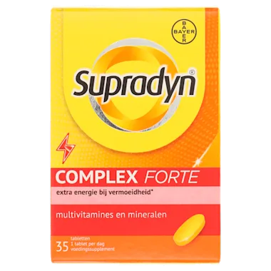 Er kunnen zich periodes voordoen waarbij je lichaam een verhoogde behoefte aan energie heeft om goed te kunnen blijven functioneren, bijvoorbeeld tijdens periodes met meer lichamelijke inspanning, geestelijke belasting, als je weerstand op de proef wordt gesteld of als je weer op krachten moet komen. Je kunt je moe en lusteloos voelen. Dan kan een extra aanvulling op de voeding met vitamines en mineralen wenselijk zijn om je energie weer op peil te brengen. Supradyn Complex Forte is speciaal samengesteld om je een steuntje in de rug te geven tijdens zulke veeleisende periodes waarin je extra energie goed kunt gebruiken. Neem, als aanvulling op je dagelijkse voeding, een hoog gedoseerde tablet om extra energie bij vermoeidheid te activeren.