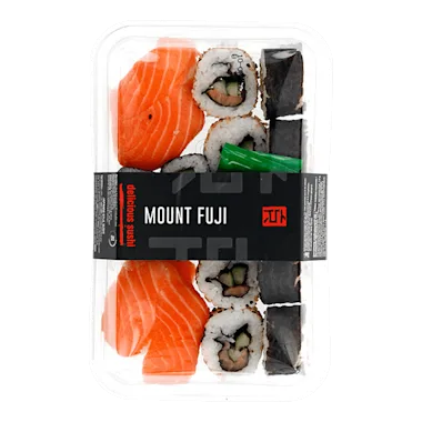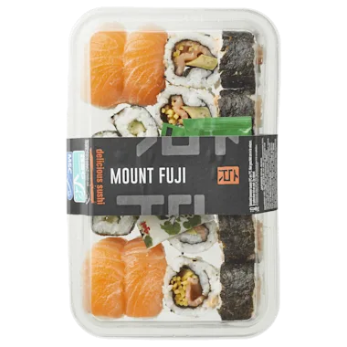 Ingrediënten: water, rijst, ZALM (ZALM, zout, water, conserveermiddel: E267), komkommer, surimi (witVIS, water, gerehydrateerde EI- eiwitpoeder (vrije uitloop), raapolie, voedingszuur: E325, maïszetmeel, TARWEmeel, erwtenzetmeel, aardappelzetmeel, gemodificeerd zetmeel (aardappel, tapioca), suiker, zout, KRABaroma (SCHAALDIER), zuurteregelaar: E575, kleurstof: E160d, conserveermiddel: E202), SOJAsaus (water, TARWE, SOJAbonen, zout), avocado, invertsuikerstroop, wortel, azijn, zonnebloemolie, SESAM, zeewier, wasabi (mierikswortel, wasabi, gemodificeerd tapioca zetmeelsiroop, zout, MOSTERDolie, voedingszuur: E300, voedingszuur: E330), zout, raapzaadolie, paprika, suiker, geleermiddel: E425, EIgeel, stabilisatoren: E420, E450, E451, E452, kurkuma, zuurteregelaar: E509, citroensap, conserveermiddel: E202, voedingszuur: E330, voedingszuur: E300, SOJA-eiwit, verdikkingsmiddel: E415, gemodificeerd maïszetmeel, MOSTERD (water, MOSTERDzaad, azijn, kruiden, zout).