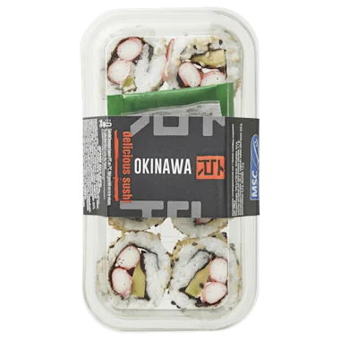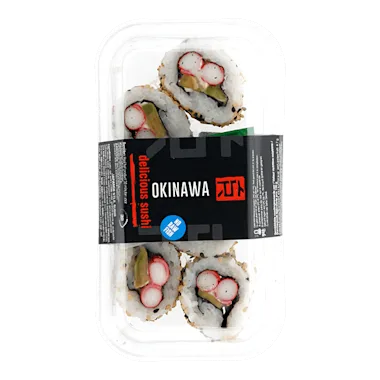 Ingrediënten: water, rijst, avocado, WITVIS, raapolie, SESAM, invertsuikerstroop, azijn, gerehydrateerde EI- EIWITpoeder (vrije uitloop), zonnebloemolie, zout, zeewier, voedingszuur: E325, mierikswortel, wasabi, SOJAbonen, TARWE, aardappelzetmeel, erwtenzetmeel, TARWEmeel, maïszetmeel, suiker, EIgeel, krabaroma (SCHAALDIER), zuurteregelaar: E575, gemodificeerd tapiocazetmeel, gemodificeerd aardappelzetmeel, glucose-fructosestroop, gemodificeerd tapioca zetmeelsiroop, MOSTERD(water, MOSTERDzaad, azijn, kruiden, zout), voedingszuur: E330, geleermiddel: E425, gemodificeerd maïszetmeel, conserveermiddel: E202, MOSTERDolie, voedingszuur: E300, natuurlijk aroma, verdikkingsmiddel: E412, kleurstof: E160a, antioxidant: E385, kleurstof: E160d.