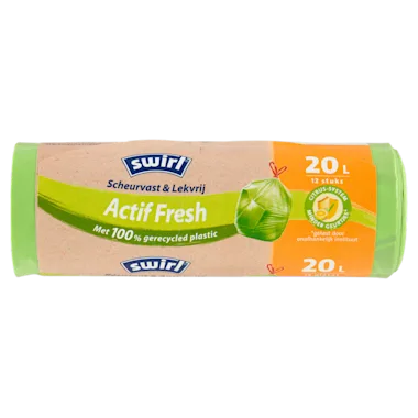 Swirl biedt consumenten betrouwbare en duurzame producten. De innovatieve technologieën van het merk - zoals scheurvaste en lekvrije afvalzakken met slimme sluitmechanismen - maken de kwaliteit van Swirl uniek. Swirl afvalzakken zijn nu gemaakt van 100%* gerecycled plastic afkomstig van de PMD afvalinzameling. Swirl gaat nog een stap verder door ook Fair Recycled® Plastic in de afvalzakken te verwerken - een initiatief van de Melitta-groep. Door de missie van de circulaire economie te volgen, biedt Swirl de combinatie die consumenten vandaag zoeken: productkwaliteit en duurzaamheid! In huishoudelijk afval ontstaat vocht. Het resultaat: geurtjes die je snel misselijk maken. De geurabsorbers in de Swirl ActifFresh afvalzakken maken hier een einde aan! Zodra er vocht in de zak komt, wordt de geurabsorbeerder actief. Zo kom je gemakkelijk van nare geurtjes af! Deze afvalzakken hebben een drielaagse folie waardoor ze zeer stevig en lekvrij zijn. Met de stevige trekbanden aan de zak kun je de zak makkelijk dichtknopen en weggooien. De ActifFresh afvalzakken van Swirl zijn milieuvriendelijk omdat ze gemaakt zijn van 100% gerecycled plastic uit afvalinzameling. Ze bevatten ook een deel Fair Recycled® Plastic, een initiatief van de Melitta groep. Swirl wil een voorloper zijn in duurzaam afvalbeheer en tegelijk de superieure kwaliteit van de afvalzakken behouden: scheurvast, lekvrij en even betrouwbaar als altijd. *Exclusief kleurstoffen en additieven