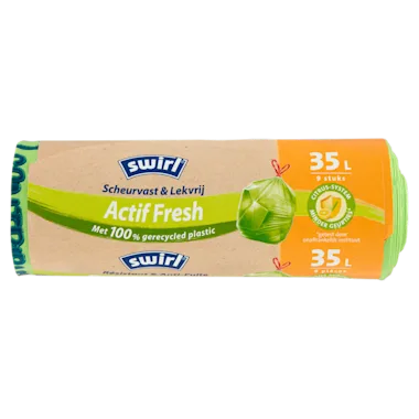 Swirl biedt consumenten betrouwbare en duurzame producten. De innovatieve technologieën van het merk - zoals scheurvaste en lekvrije afvalzakken met slimme sluitmechanismen - maken de kwaliteit van Swirl uniek. Swirl afvalzakken zijn nu gemaakt van 100%* gerecycled plastic afkomstig van de PMD afvalinzameling. Swirl gaat nog een stap verder door ook Fair Recycled® Plastic in de afvalzakken te verwerken - een initiatief van de Melitta-groep. Door de missie van de circulaire economie te volgen, biedt Swirl de combinatie die consumenten vandaag zoeken: productkwaliteit en duurzaamheid! In huishoudelijk afval ontstaat vocht. Het resultaat: geurtjes die je snel misselijk maken. De geurabsorbers in de Swirl ActifFresh afvalzakken maken hier een einde aan! Zodra er vocht in de zak komt, wordt de geurabsorbeerder actief. Zo kom je gemakkelijk van nare geurtjes af! Deze afvalzakken hebben een drielaagse folie waardoor ze zeer stevig en lekvrij zijn. Met de stevige trekbanden aan de zak kun je de zak makkelijk dichtknopen en weggooien. De ActifFresh afvalzakken van Swirl zijn milieuvriendelijk omdat ze gemaakt zijn van 100% gerecycled plastic uit afvalinzameling. Ze bevatten ook een deel Fair Recycled® Plastic, een initiatief van de Melitta groep. Swirl wil een voorloper zijn in duurzaam afvalbeheer en tegelijk de superieure kwaliteit van de afvalzakken behouden: scheurvast, lekvrij en even betrouwbaar als altijd. *Exclusief kleurstoffen en additieven