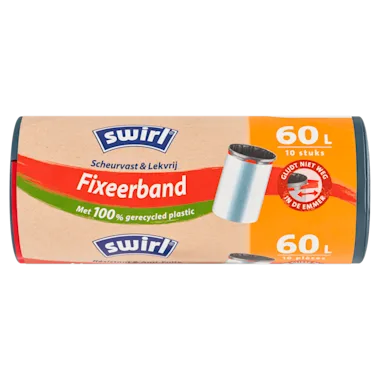 Swirl biedt consumenten betrouwbare en duurzame producten. De innovatieve technologieën van het merk - zoals scheurvaste en lekvrije afvalzakken met slimme sluitmechanismen - maken de kwaliteit van Swirl uniek. Swirl afvalzakken zijn nu gemaakt van 100%* gerecycled plastic afkomstig van de PMD afvalinzameling. Swirl gaat nog een stap verder door ook Fair Recycled® Plastic in de afvalzakken te verwerken - een initiatief van de Melitta-groep. Door de missie van de circulaire economie te volgen, biedt Swirl de combinatie die consumenten vandaag zoeken: productkwaliteit en duurzaamheid! Een zak die veilig vastzit in de vuilnisemmer... Het is allemaal mogelijk dankzij de fixeerband! De afvalzak zit vast aan de randen van de afvalbak, zodat hij er niet inglijdt en de afvalbak niet vuil wordt. Makkelijk op te spannen en klaar! Bovendien is de volle zak net zo gemakkelijk te verwijderen: gewoon de fixeerband dichtknopen en weg ben je! Het is een handig handvat voor het weggooien van je afvalzak. Deze afvalzakken hebben een drielaagse folie waardoor ze zeer stevig zijn. Zo voorkom je een veelvoorkomend probleem bij vuilniszakken: zakken die lekken. De Fixeerband afvalzakken van Swirl zijn milieuvriendelijk omdat ze gemaakt zijn van 100% gerecycled plastic uit afvalinzameling. Ze bevatten ook een deel Fair Recycled® Plastic, een initiatief van de Melitta groep. Swirl wil een voorloper zijn in duurzaam afvalbeheer en tegelijk de superieure kwaliteit van de afvalzakken behouden: scheurvast, lekvrij en even betrouwbaar als altijd. *Exclusief kleurstoffen en additieven
