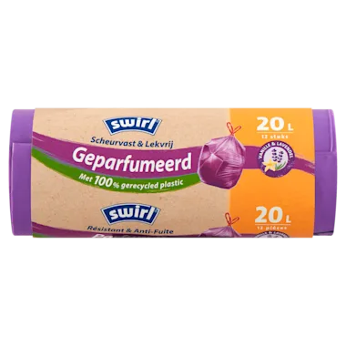 Swirl biedt consumenten betrouwbare en duurzame producten. De innovatieve technologieën van het merk - zoals scheurvaste en lekvrije afvalzakken met slimme sluitmechanismen - maken de kwaliteit van Swirl uniek. Swirl afvalzakken zijn nu gemaakt van 100%* gerecycled plastic afkomstig van de PMD afvalinzameling. Swirl gaat nog een stap verder door ook Fair Recycled® Plastic in de afvalzakken te verwerken - een initiatief van de Melitta-groep. Door de missie van de circulaire economie te volgen, biedt Swirl de combinatie die consumenten vandaag zoeken: productkwaliteit en duurzaamheid! Geniet elke dag opnieuw van het gevoel van hygiënische frisheid. Met de zakken van Swirl verspreiden er een frisse vanille-lavendelgeur en het verwisselen van afvalzakken is nu veel aangenamer! Ze zijn waterdicht en ultra-bestendig. Bovendien zijn deze zakken heel praktisch: dankzij de praktische trekband is het afval snel opgeborgen en kan het moeiteloos worden weggegooid. Swirl afvalzakken met Vanilla Lavender geur zijn milieuvriendelijk omdat ze gemaakt zijn van 100%* gerecycleerd plastic afkomstig van afvalinzameling. Ze bevatten ook een deel Fair Recycled® Plastic, een initiatief van de Melitta-groep. Swirl wil een voorloper zijn in duurzaam afvalbeheer en tegelijk de superieure kwaliteit van afvalzakken behouden: scheurvast, waterdicht en even betrouwbaar als altijd. *Exclusief kleurstoffen en additieven