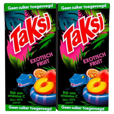 Geen suiker toegevoegd. Rijk aan vitamine C. Met 40% zuivel. Bevat alleen van nature aanwezige suikers. Verder zijn de suikers vervangen door een zoetstof en bevat deze Taksi alleen van nature aanwezige suikers uit fruit en zuivel.