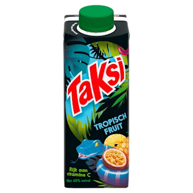 Met Taksi waan je je even in de jungle. Taksi Tropisch Fruit is een heerlijke mix van sap uit ananas, passievrucht en appel. Een smaakexplosie met zuivel en rijk aan vitamine C en D. Daardoor is Taksi nét even anders, en dat proef je!