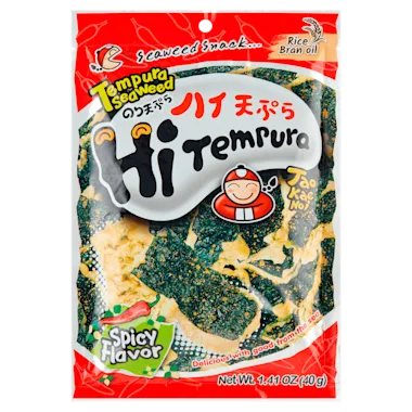 Ingrediënten: tempura-mixmeel 40% (TARWEbloem, gemodificeerd tapiocazetmeel, EIWITPOEDER, zout, suiker ), rijstzemelenolie (rijstzemelenkolie, rozemarijnextract), zeewier (Puropia spp) 20%, tempura pittige smaakkruiden [specerijen (knoflook, peper, ui, chili 0,7%), suiker, gehydrolyseerd SOJA-eiwit, zout, maltodextrine, smaakversterker (E627, E631)].