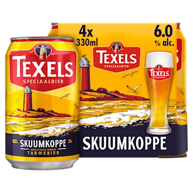 Texels Skuumkoppe (6.0%) is een bovengistend donker tarwebier, gebrouwen van natuurlijke ingrediënten. Dit speciaalbier dat zijn naam ontleent aan de witte koppen op de golven van de zee, is vol van smaak met hints van karamel en abrikoos en heeft een romige, licht zoete afdronk. Texels Skuumkoppe is een bier dat bij ieder seizoen past. Een bier puur, robuust en recht door zee, net als Texel zelf.