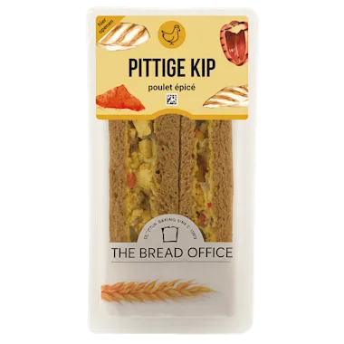 Wit meergranenbrood met zaden en pitten met 31% gegaarde kip, 12% zoetzure paprika, 9%mayonaise, en 1,5% pittige kruiden