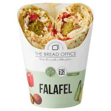Wrap met spinazie met 20% falafel, 15% spitskool, 12% hummus, 10% paprika, 5% veganmayonaise, 1,2% piri piri kruiden