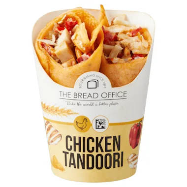 Wrap met 0,3% tomaat met 30% geroosterde kipblokjes, 13% mayonaise, 10% gegrilde rode paprika, 10% spitskool en 0,7% tandoori kruiden