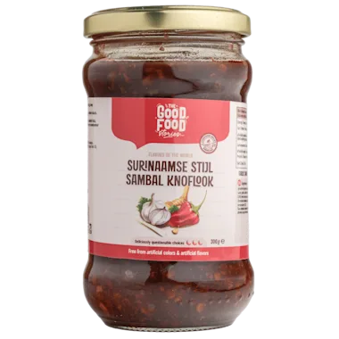 Ingrediënten: gemalen rode peper, uien, suiker, water nknoflook, zuurteregaal: E260; kruiden en specerijen, TRASSIE (gefermenteerde GARNALENpasta), zout, conserveermiddel: E211. Kan bevatten: PINDA's, NOTEN, GLUTEN, SOJA en SESAM.