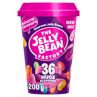De 36 verschillende smaken van The Jelly Bean Factory zorgen voor een continue smaakexplosie! Iedere jelly bean heeft een unieke smaak die je proeft vanuit de zachte kern tot aan de crispy buitenkant. De snoepjes zijn verpakt in een handige hersluitbare 90g papieren koker. Deze jelly beans zijn 100% natuurlijk en glutenvrij.
