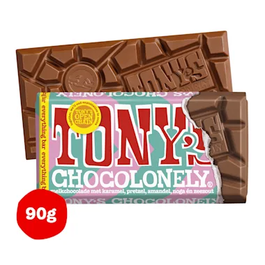 Belgische melkchocolade met stukjes karamel, pretzel, amandel, noga en zeezout.