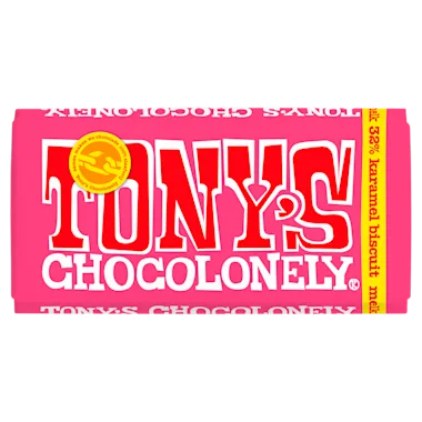 Belgische melkchocolade met stukjes karamel en biscuit.