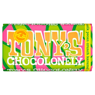 Belgische Fairtrade melkchocolade met stukjes koek, stukjes pecan en stukjes karamel.