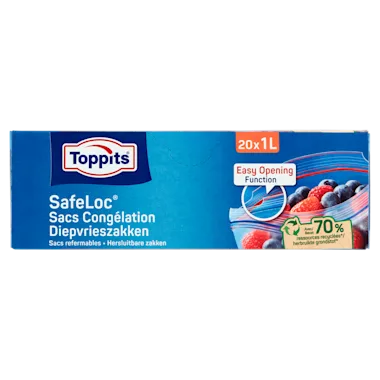 Dankzij de flexibele platte bodem zijn de SafeLoc Diepvrieszakken van Toppits heel gemakkelijk te vullen. Dankzij de dubbele sluiting kun je de zak veilig sluiten nadat je een portie hebt ontdooid.