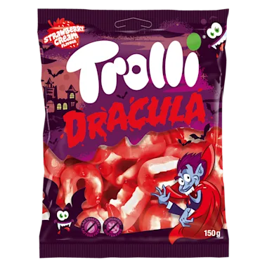 Fruitgums met een bite. De griezelige Trolli Dracula-Tanden met een heerlijke aardbeien-roomsmaak zijn het perfecte Halloween snoepje voor kleine en grote geesten.