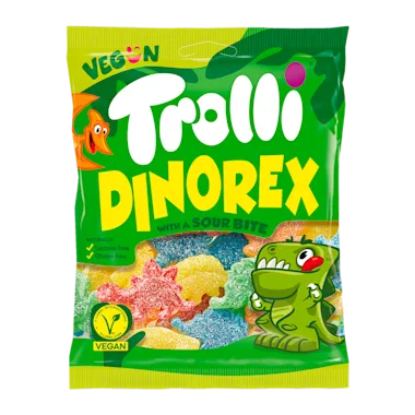 Ze behoren tot de wilde leden van onze familie: de Dino Rex. Met hun bijtende textuur en fruitig-zure smaak zijn de fruitgomdinosaurussen populairder dan ooit. En 100% veganistisch. In de smaken: aardbei-framboos, limquat-limoen, citroen, sinaasappel, framboos, bosbes