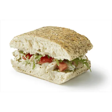 wit tarwebrood met kruiden (TARWEBLOEM, water, olijfolie, gejodeerd zout, gist, TARWEZUURDESEM, rijstemeel, oregano, basilicum, rozemarijn, zeezout, meelverbeteraar: E300, enzymen (TARWE)), buffelmozzarella (BUFFELMELK, zout, stremsel), kipdijfiletreepjes (kipdijfilet, voedingszuur: E262/E326/E330, aardappelzetmeel, zout, dextrose, conserveermiddel: gebufferde azijn, rozemarijnextract, zonnebloemolie), rucola, groene pesto (zonnebloemolie, basilicum, geraspte kaas (MELK, zout, aardappelzetmeel, zuursel, stremsel), CASHEWNOTEN, water, azijn, citroensap, knoflook, suiker, zout, specerijen, verdikkingsmiddel: guarpitmeel/xanthaangom), tomaten, Italiaanse kruiden (oregano, rozemarijn, tijm, majoraan).
