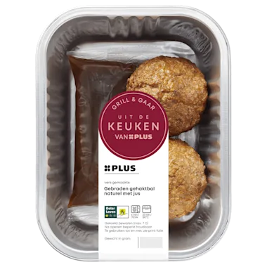 Oven (160°C): verwarm de gehaktballen in de schaal ca. 10 minuten in het midden van een voorverwarmde oven. Voeg de jus uit het zakje toe en verwarm nog 6-8 minuten.